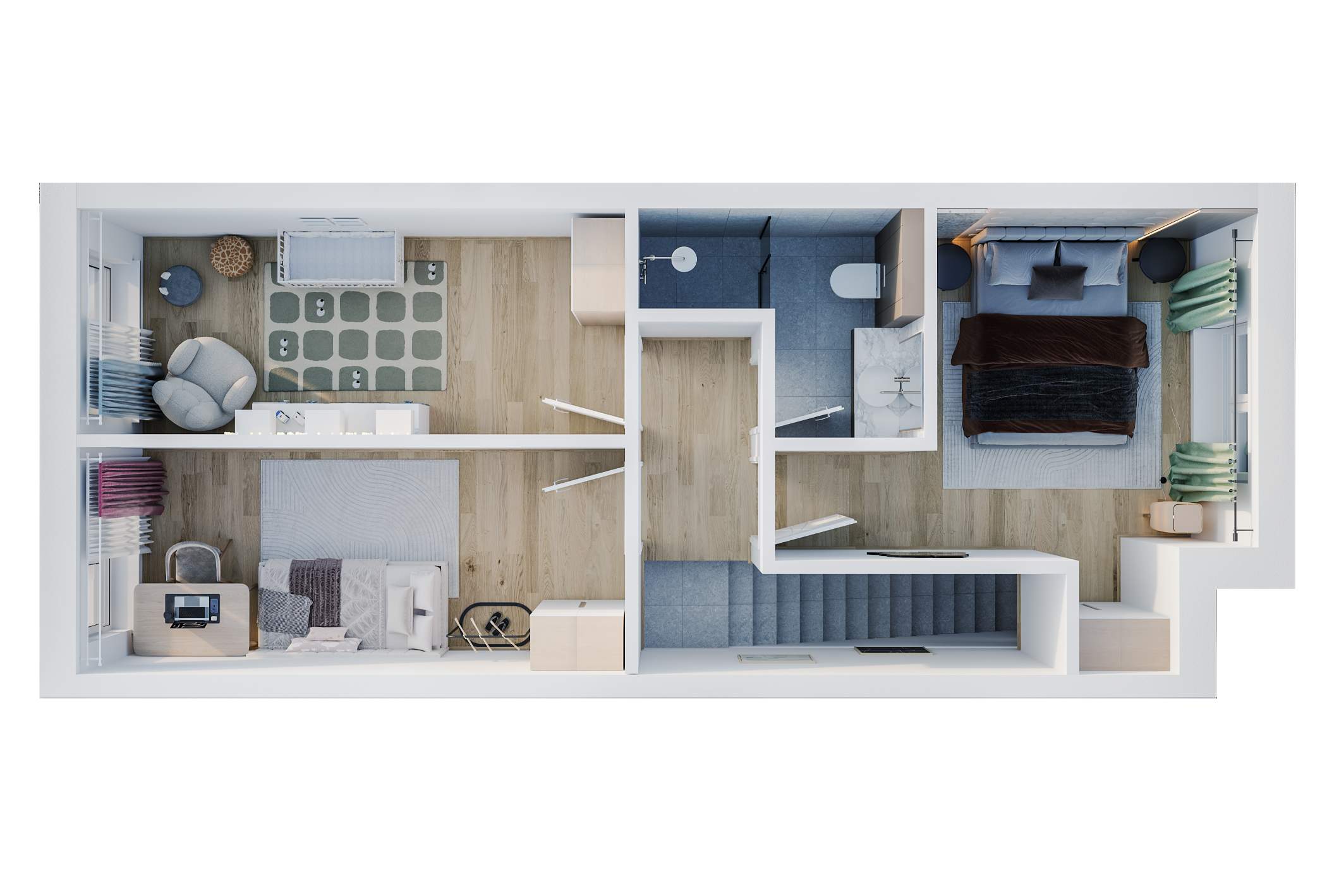 U svakom stanu su predviđena dva kupatila kojim se nalazi “walk in shower” sa podnim grejanjem i staklenom pregradom izrađenom prema meri (okovi u crnoj boji)